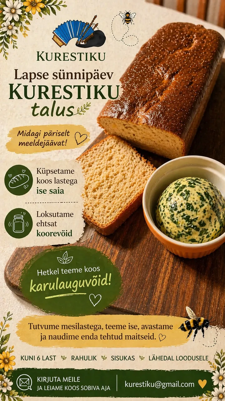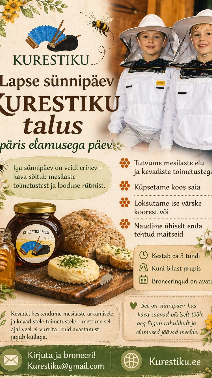 Kurestiku talus saavad kuni 6 last osa rahulikust ja sisukast sünnipäevast, kus igaüks saab ise käed külge panna, uusi asju avastada ja ühiselt midagi valmis teha