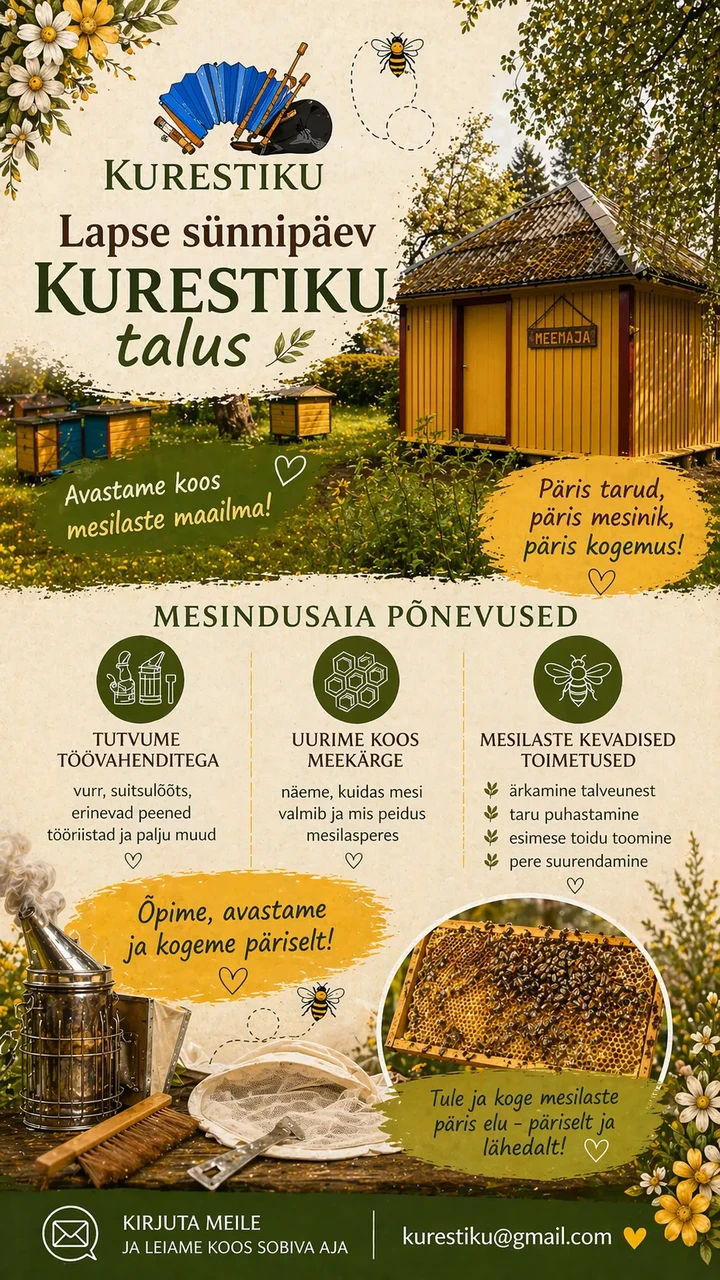 Sünnipäeval tutvume mesilaste elu ja kevadiste toimetustega, küpsetame koos saia ning loksutame ise värske või.
